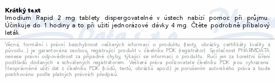 Imodium Rapid 2 mg tablety dispergovatelné v ústech nabízí pomoc při průjmu. Účinkuje do 1 hodiny a to při užití jednorázové dávky 4 mg. Čtěte pozorně příbalový leták.