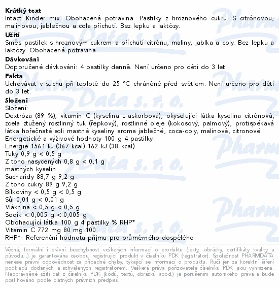 Intact Kinder mix. Obohacená potravina. Pastilky z hroznového cukru. S citrónovou, malinovou, jablečnou a cola příchutí. Bez lepku a laktózy.