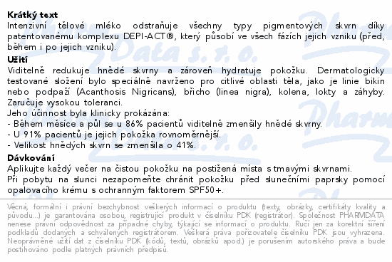 Intenzivní tělové mléko odstraňuje všechny typy pigmentových skvrn díky patentovanému komplexu DEPI-ACT®, který působí ve všech fázích jejich vzniku (před, během i po jejich vzniku).