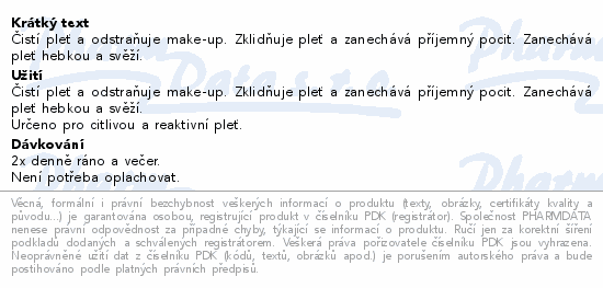 Čistí pleť a odstraňuje make-up. Zklidňuje pleť a zanechává příjemný pocit. Zanechává pleť hebkou a svěží.