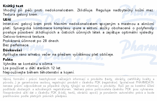 Vhodný při péči proti nedokonalostem. Zklidňuje. Reguluje nadbytečný kožní maz. Textura gelový krém.