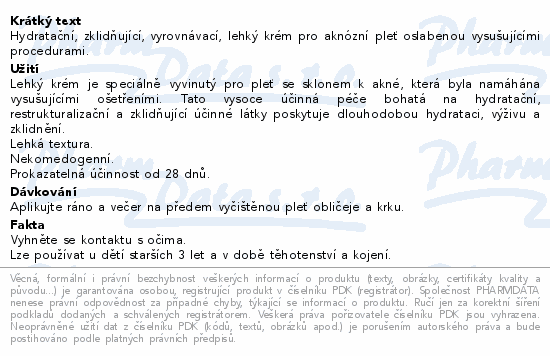 Hydratační, zklidňující, vyrovnávací, lehký krém pro aknózní pleť oslabenou vysušujícími procedurami.