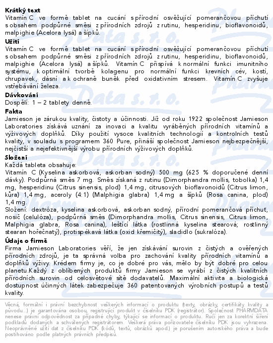 Vitamín C ve formě tablet na cucání s přírodní osvěžující pomerančovou příchutí s obsahem podpůrné směsi z přírodních zdrojů z rutinu, hesperidinu, bioflavonoidů, malpighie (Acelora lysá) a šípků.