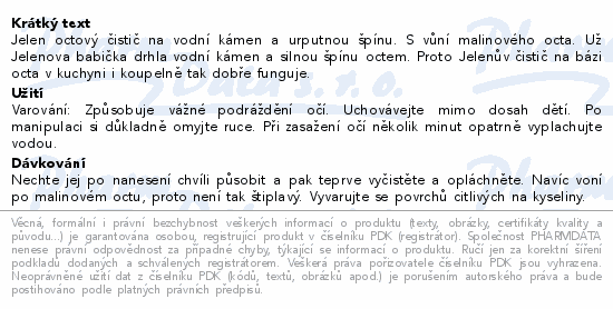 Jelen octový čistič na vodní kámen a urputnou špínu. S vůní malinového octa. Už Jelenova babička drhla vodní kámen a silnou špínu octem. Proto Jelenův čistič na bázi octa v kuchyni i koupelně tak dobře funguje.