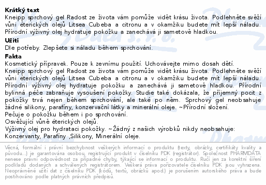 Kneipp sprchový gel Radost ze života vám pomůže vidět krásu života. Podlehněte svěží vůni éterických olejů Litsea Cubeba a citronu a v okamžiku budete mít lepší náladu. Přírodní výživný olej hydratuje pokožku a zanechává ji sametově hladkou.