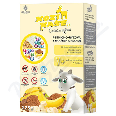 Obilno-mléčná kaše s kojeneckým kozím mlékem v prášku. Bez přídavku cukrů. Obilno-mléčný příkrm pro výživu kojenců a malých dětí od ukončeného 7. měsíce věku - jako součást vyvážené smíšené stravy. Vhodné při zavádění lepku do stravy.