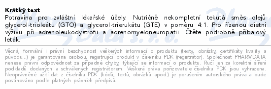 Potravina pro zvláštní lékařské účely. Nutričně nekompletní tekutá směs olejů glycerol-trioleátu (GTO) a glycerol-trierukátu (GTE) v poměru 4:1. Pro řízenou dietní výživu při adrenoleukodystrofii a adrenomyeloneuropatii. Čtěte pozorně příbalový leták.