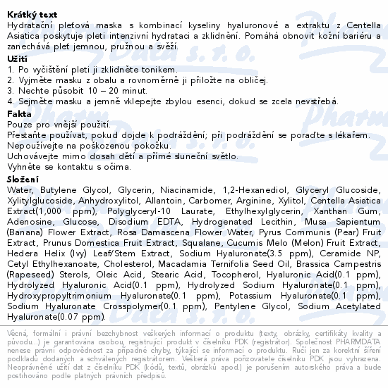 Hydratační pleťová maska s kombinací kyseliny hyaluronové a extraktu z Centella Asiatica poskytuje pleti intenzivní hydrataci a zklidnění. Pomáhá obnovit kožní bariéru a zanechává pleť jemnou, pružnou a svěží.