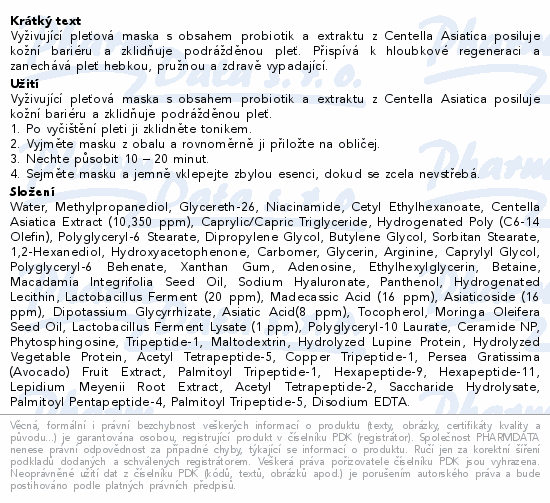 Vyživující pleťová maska s obsahem probiotik a extraktu z Centella Asiatica posiluje kožní bariéru a zklidňuje podrážděnou pleť. Přispívá k hloubkové regeneraci a zanechává pleť hebkou, pružnou a zdravě vypadající.