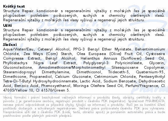 Structure Repair kondicionér s regeneračními výtažky z mořských řas je speciálně přizpůsoben potřebám poškozených, suchých a chemicky ošetřených vlasů. Regenerační výtažky z mořských řas vlasy vyživují a regenerují jejich strukturu.
