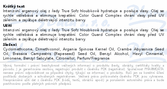 Intenzivní arganový olej z řady True Sofz hloubkově hydratuje a posiluje vlasy. Olej se rychle vstřebává a eliminuje krepatění. Color Guard Complex chrání vlasy před UV zářením a zajišťuje déletrvající intenzitu barvy.