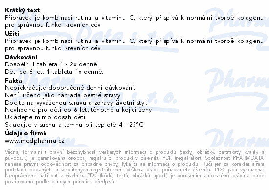 Přípravek je kombinací rutinu a vitaminu C, který přispívá k normální tvorbě kolagenu pro správnou funkci krevních cév.