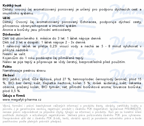 Dětský ovocný čaj aromatizovaný porcovaný je určený pro podporu dýchacích cest a imunitního systému.