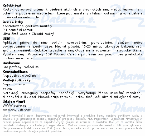 Roztok oplachový určený k ošetření akutních a chronických ran, vředů, řezných ran, odřenin a popálenin včetně těch, které jsou umístěny v tělních dutinách, jako je ústní a nosní dutina nebo ucho.