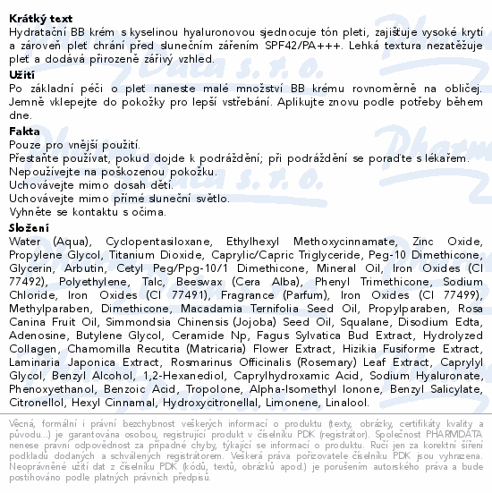 Hydratační BB krém s kyselinou hyaluronovou sjednocuje tón pleti, zajišťuje vysoké krytí a zároveň pleť chrání před slunečním zářením SPF42