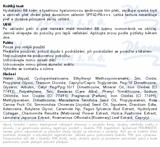 Hydratační BB krém s kyselinou hyaluronovou sjednocuje tón pleti, zajišťuje vysoké krytí a zároveň pleť chrání před slunečním zářením SPF42