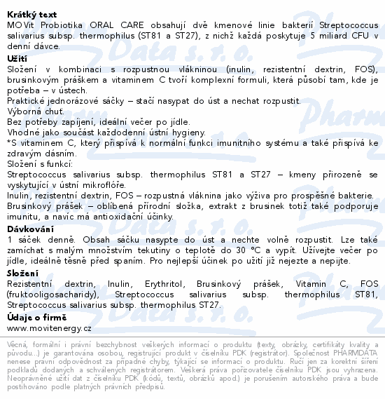 MOVit Probiotika ORAL CARE obsahují dvě kmenové linie bakterií Streptococcus salivarius subsp. thermophilus (ST81 a ST27), z nichž každá poskytuje 5 miliard CFU v denní dávce.