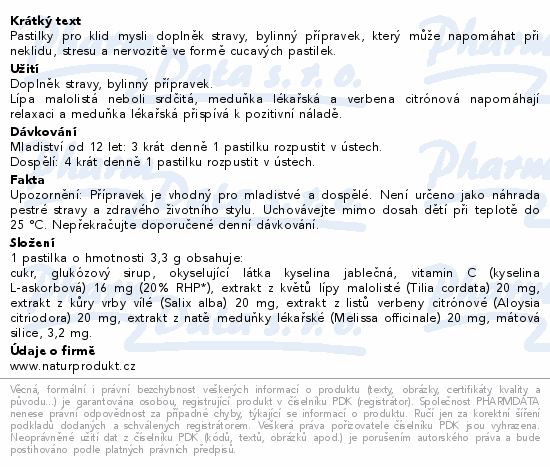 Pastilky pro klid mysli doplněk stravy, bylinný přípravek, který může napomáhat při neklidu, stresu a nervozitě ve formě cucavých pastilek.