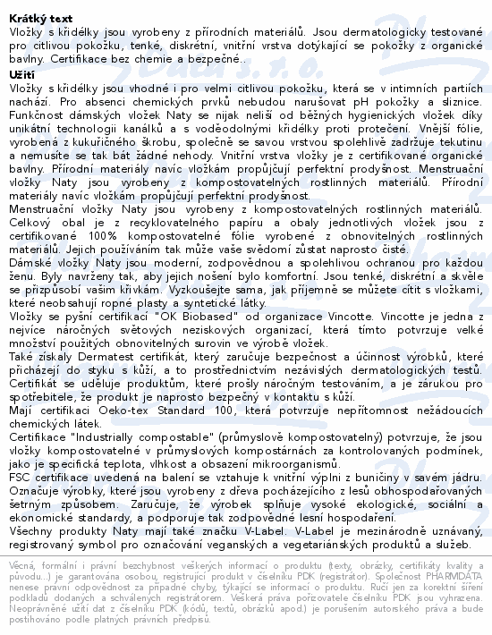 Vložky s křidélky jsou vyrobeny z přírodních materiálů. Jsou dermatologicky testované pro citlivou pokožku, tenké, diskrétní, vnitřní vrstva dotýkající se pokožky z organické bavlny. Certifikace bez chemie a bezpečné..
