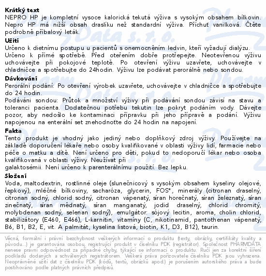 NEPRO HP je kompletní vysoce kalorická tekutá výživa s vysokým obsahem bílkovin. Nepro HP má nižší obsah draslíku než standardní výživa. Příchuť vanilková. Čtěte pozorně příbalový leták.