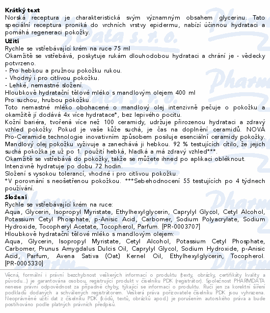 Norská receptura je charakteristická svým významným obsahem glycerinu. Tato speciální receptura proniká do vrchních vrstvy epidermu, nabízí účinnou hydrataci a pomáhá regeneraci pokožky.