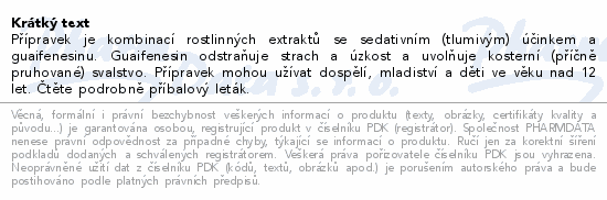 Přípravek je kombinací rostlinných extraktů se sedativním (tlumivým) účinkem a guaifenesinu. Guaifenesin odstraňuje strach a úzkost a uvolňuje kosterní (příčně pruhované) svalstvo. Přípravek mohou užívat dospělí, mladiství a děti ve věku nad 12 let. Čtěte pozorně příbalový leták.