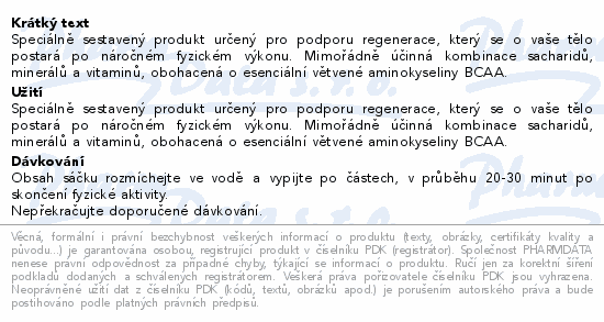Speciálně sestavený produkt určený pro podporu regenerace, který se o vaše tělo postará po náročném fyzickém výkonu. Mimořádně účinná kombinace sacharidů, minerálů a vitaminů, obohacená o esenciální větvené aminokyseliny BCAA.