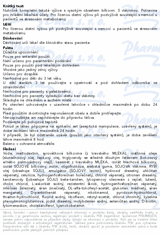 Nutričně kompletní tekutá výživa s vysokým obsahem bílkovin. S vlákninou. Potravina pro zvláštní lékařské účely. Pro řízenou dietní výživu při podvýživě související s nemocí u pacientů ve stresovém metabolismu.