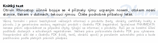 Otrivin Rhinostop účinně bojuje se 4 příznaky rýmy: ucpaným nosem, otokem nosní sliznice, tlakem v dutinách, tekoucí rýmou. Čtěte pozorně příbalový leták.