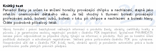 Panadol Baby je určen ke snížení horečky provázející chřipku a nachlazení, stejně jako infekční onemocnění dětského věku. Je též vhodný k tlumení bolesti provázející prořezávání zubů, bolesti zubů, bolesti v krku při chřipce a nachlazení a bolesti hlavy. Čtěte pozorně příbalový leták.