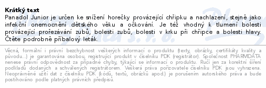 Panadol Junior je určen ke snížení horečky provázející chřipku a nachlazení, stejně jako infekční onemocnění dětského věku a očkování. Je též vhodný k tlumení bolesti provázející prořezávání zubů, bolesti zubů, bolesti v krku při chřipce a bolesti hlavy. Čtěte pozorně příbalový leták.