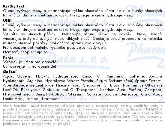Cíleně vyživuje vlasy a harmonizuje cyklus vlasového růstu aktivuje buňky vlasových folikulů zklidňuje a ošetřuje pokožku hlavy, regeneruje a hydratuje vlasy.