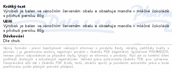Výrobek je balen ve vánočním červeném obalu a obsahuje mandle v mléčné čokoládě s příchutí perníku 80g.
