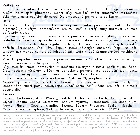 Přírodní bělení zubů - Intenzivní bělící zubní pasta. Domácí dentální hygiena pomáhá zubům získat zpět přirozenou bělost díky speciální směsi abrazivních mikročástic získaných z lastur patřících do čeledi Diatomaceae již po několika aplikacích.
