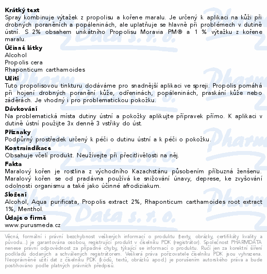 Spray kombinuje výtažek z propolisu a kořene maralu. Je určený k aplikaci na kůži při drobných poraněních a popáleninách, ale uplatňuje se hlavně při problémech v dutině ústní. S 2% obsahem unikátního Propolisu Moravia PM® a 1 % výtažku z kořene maralu.