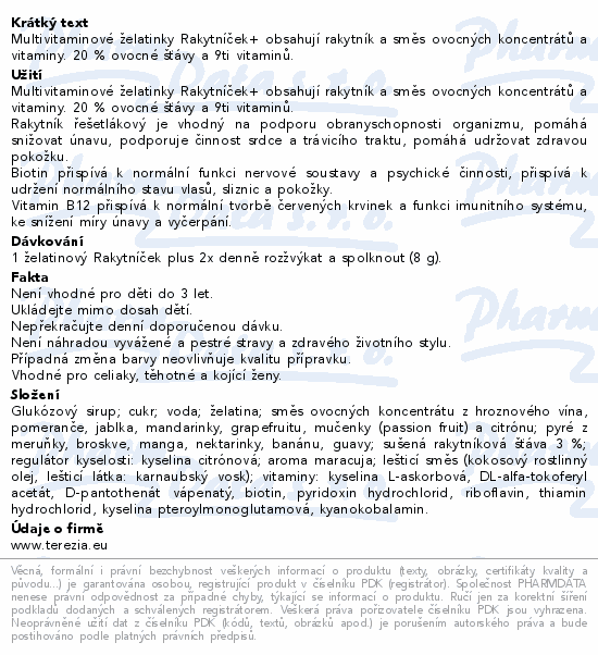 Multivitaminové želatinky Rakytníček+ obsahují rakytník a směs ovocných koncentrátů a vitaminy. 20 % ovocné šťávy a 9ti vitaminů.