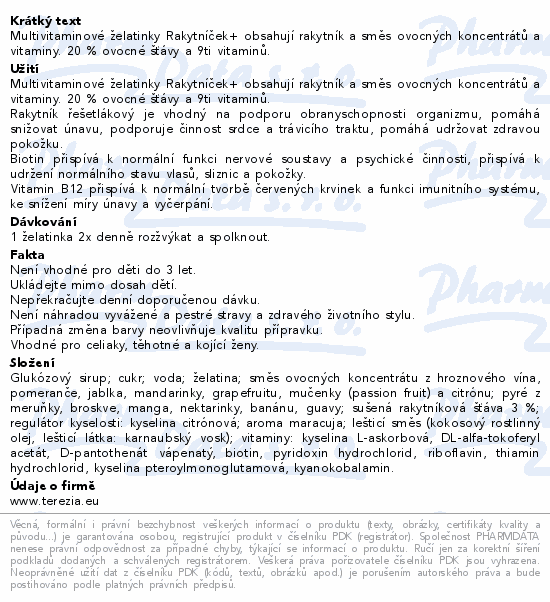 Multivitaminové želatinky Rakytníček+ obsahují rakytník a směs ovocných koncentrátů a vitaminy. 20 % ovocné šťávy a 9ti vitaminů.