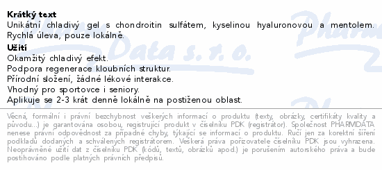 Unikátní chladivý gel s chondroitin sulfátem, kyselinou hyaluronovou a mentolem. Rychlá úleva, pouze lokálně.