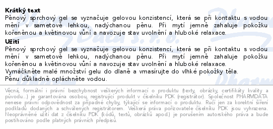 Pěnový sprchový gel se vyznačuje gelovou konzistencí, která se při kontaktu s vodou mění v sametově lehkou, nadýchanou pěnu. Při mytí jemně zahaluje pokožku kořeněnou a květinovou vůní a navozuje stav uvolnění a hluboké relaxace.
