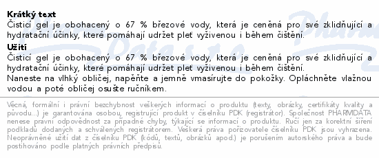 Čisticí gel je obohacený o 67 % březové vody, která je ceněná pro své zklidňující a hydratační účinky, které pomáhají udržet pleť vyživenou i během čištění.