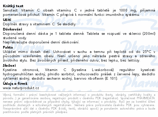 Sanotact Vitamín C obsah vitamínu C v jedné tabletě je 1000 mg, příjemná pomerančová příchuť. Vitamín C přispívá k normální funkci imunitního systému.