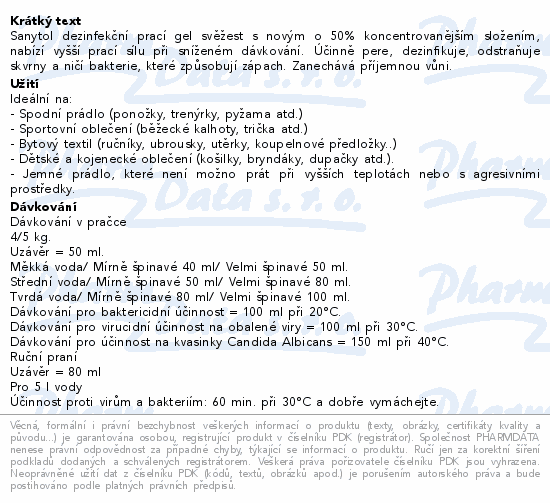 Sanytol dezinfekční prací gel svěžest s novým o 50% koncentrovanějším složením, nabízí vyšší prací sílu při sníženém dávkování. Účinně pere, dezinfikuje, odstraňuje skvrny a ničí bakterie, které způsobují zápach. Zanechává příjemnou vůni.