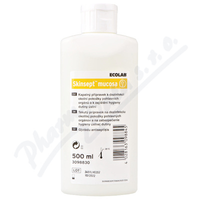 SKINSEPT MUCOSA 500 ml dezinfekce úst, hltanu a pokožky. Skinsept mucosa je biocidní přípravek k zamezení růstu mikroorganismů v dutině ústní a hltanu a na okolní pokožce pohlavních orgánů, k jejich dezinfekci před operacemi, zaváděním cévek apod.