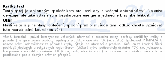 Tento sprej je dokonalým společníkem pro letní dny a večerní dobrodružství. Nejenže osvěžuje, ale také vytváří auru bezstarostné energie a jedinečné brazilské lehkosti.