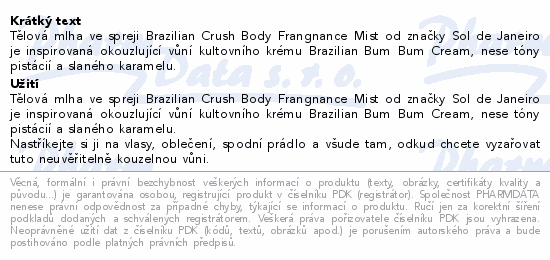 Tělová mlha ve spreji Brazilian Crush Body Frangnance Mist od značky Sol de Janeiro je inspirovaná okouzlující vůní kultovního krému Brazilian Bum Bum Cream, nese tóny pistácií a slaného karamelu.