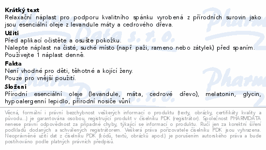 Relaxační náplast pro podporu kvalitního spánku vyrobená z přírodních surovin jako jsou esenciální oleje z levandule máty a cedrového dřeva.