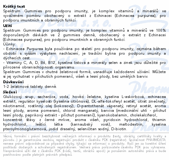 Spektrum Gummies pro podporu imunity, je komplex vitaminů a minerálů ve vyváženém poměru obohacený o extrakt z Echinacei (Echinacea purpurea), pro podporu imunitních a obranných funkcí.