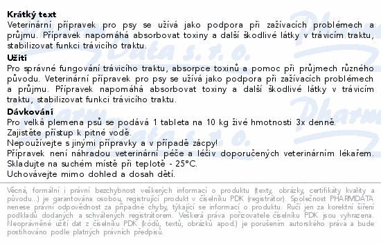 Veterinární přípravek pro psy se užívá jako podpora při zažívacích problémech a průjmu. Přípravek napomáhá absorbovat toxiny a další škodlivé látky v trávicím traktu, stabilizovat funkci trávicího traktu.