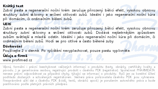 Zubní pasta a regenerační noční krém zaručuje přirozený bělicí efekt, vysokou obnovu struktury zubní skloviny a snížení citlivosti zubů. Ideální i jako regenerační noční kúra při domácím, či ordinačním bělení zubů.