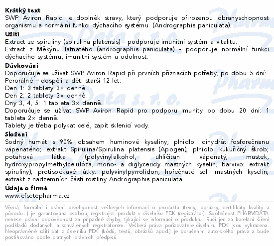 SWP Aviron Rapid je doplněk stravy, který podporuje přirozenou obranyschopnost organismu a normální funkci dýchacího systému. (Andrographis paniculata).